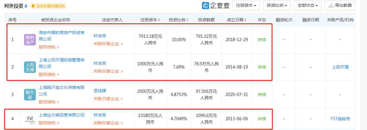 而這家公司全部對外投資業(yè)務里,四家公司三家都與林瑞陽(林瑞陽本名林吉榮)有關。