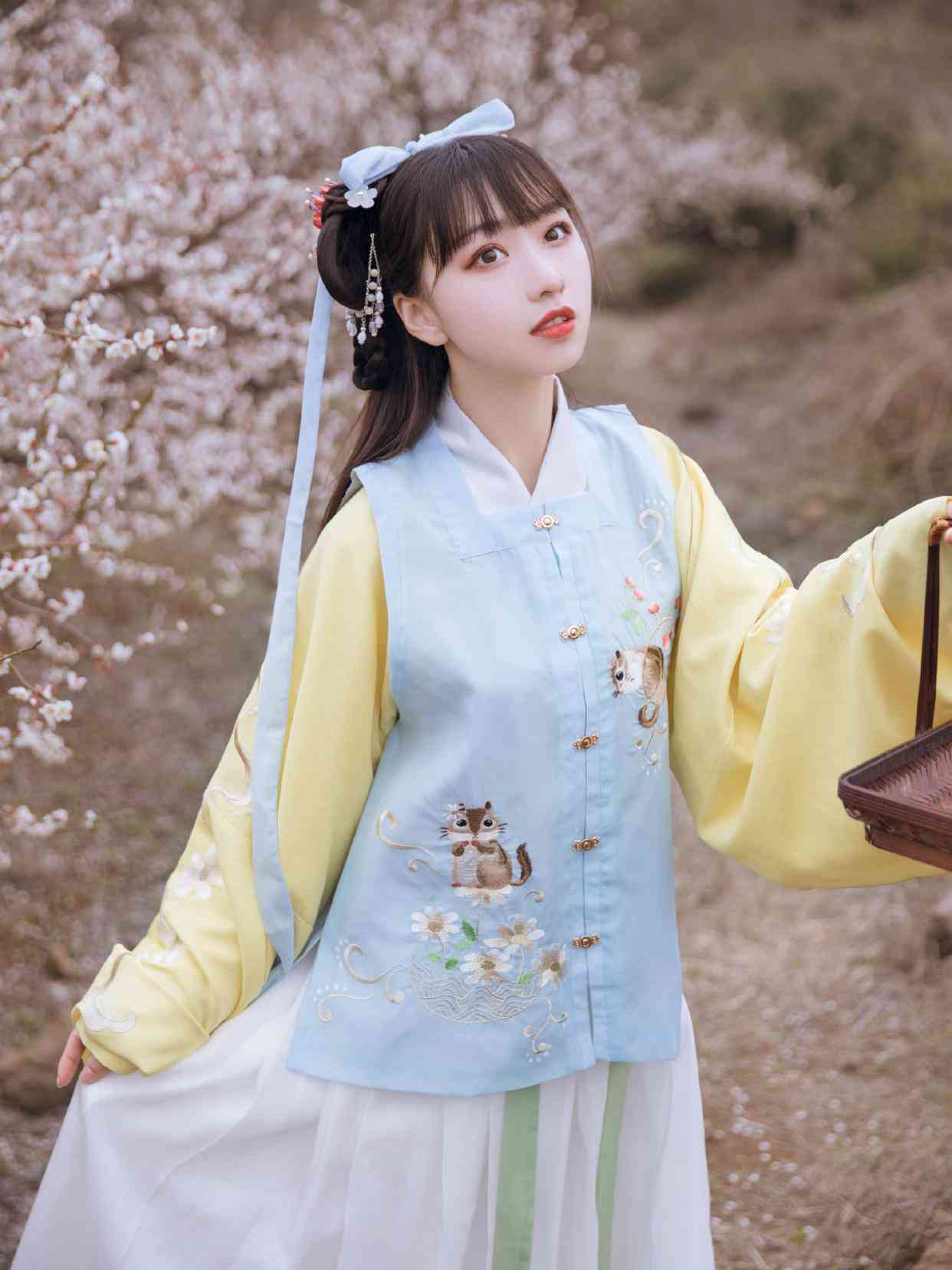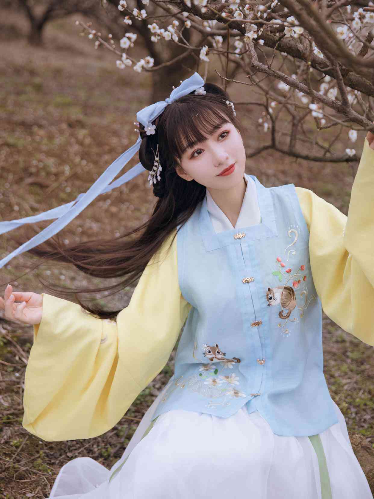 衣服上繡著的小松鼠看起來乖巧伶俐,好像擁有這件漢服的主人也是如此,呆萌的樣子真是十分令人心動呢。