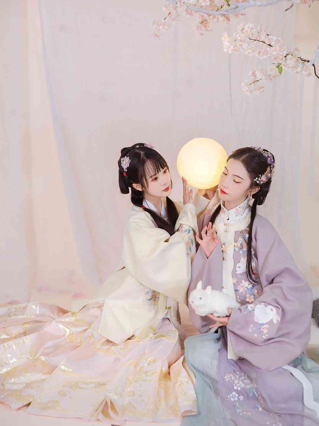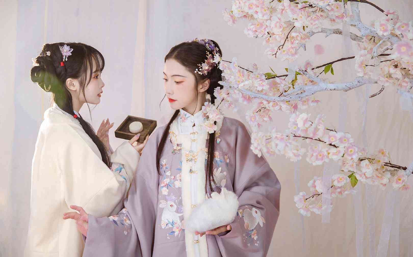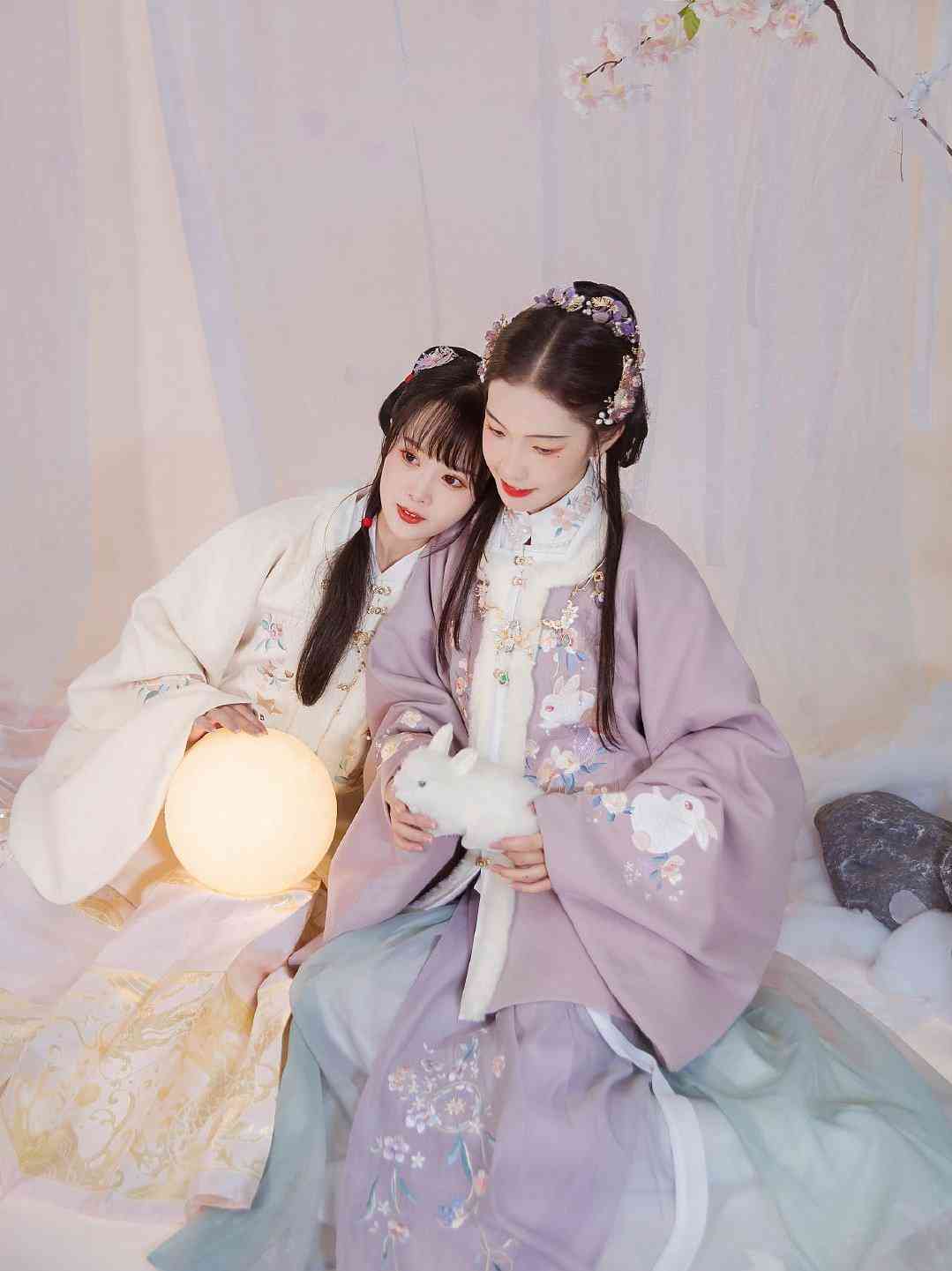 在漢服的選擇上面我們可以看到,圖中這位小姐姐身上穿的是一件明制漢服,上衣以藕荷色為主要顏色,藕荷色是一種十分溫柔的顏色,紐扣處還使用了絨毛做封邊,看起來毛茸茸的,增添了一絲可愛感,衣服上面繡滿了漂亮的刺繡,其中還有雪白的小兔子,十分精致。