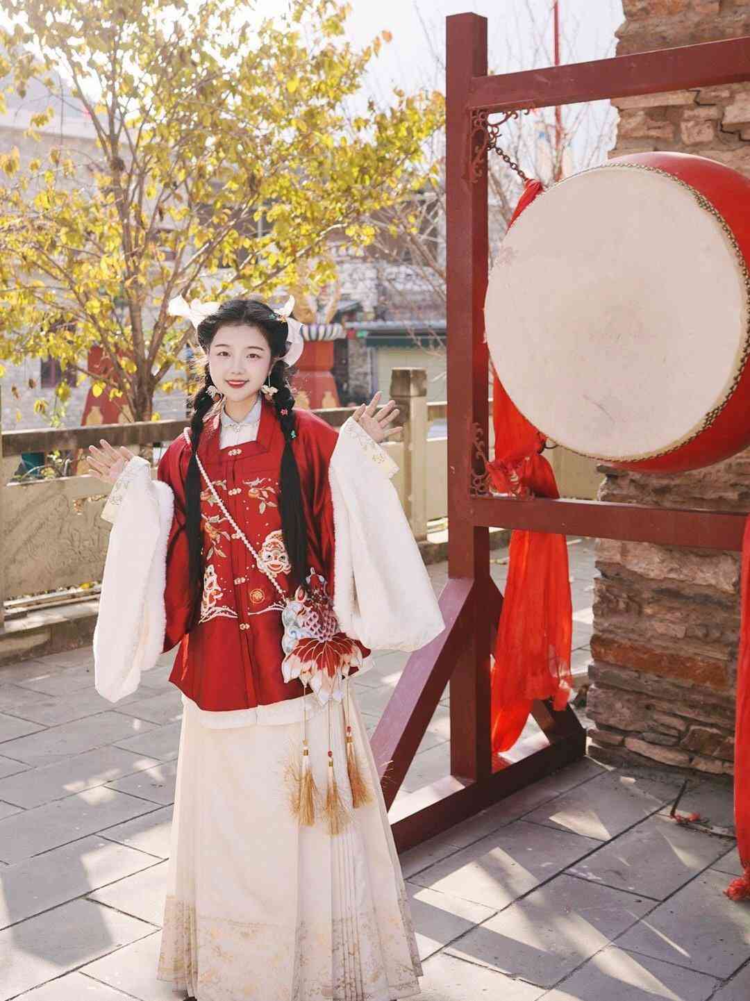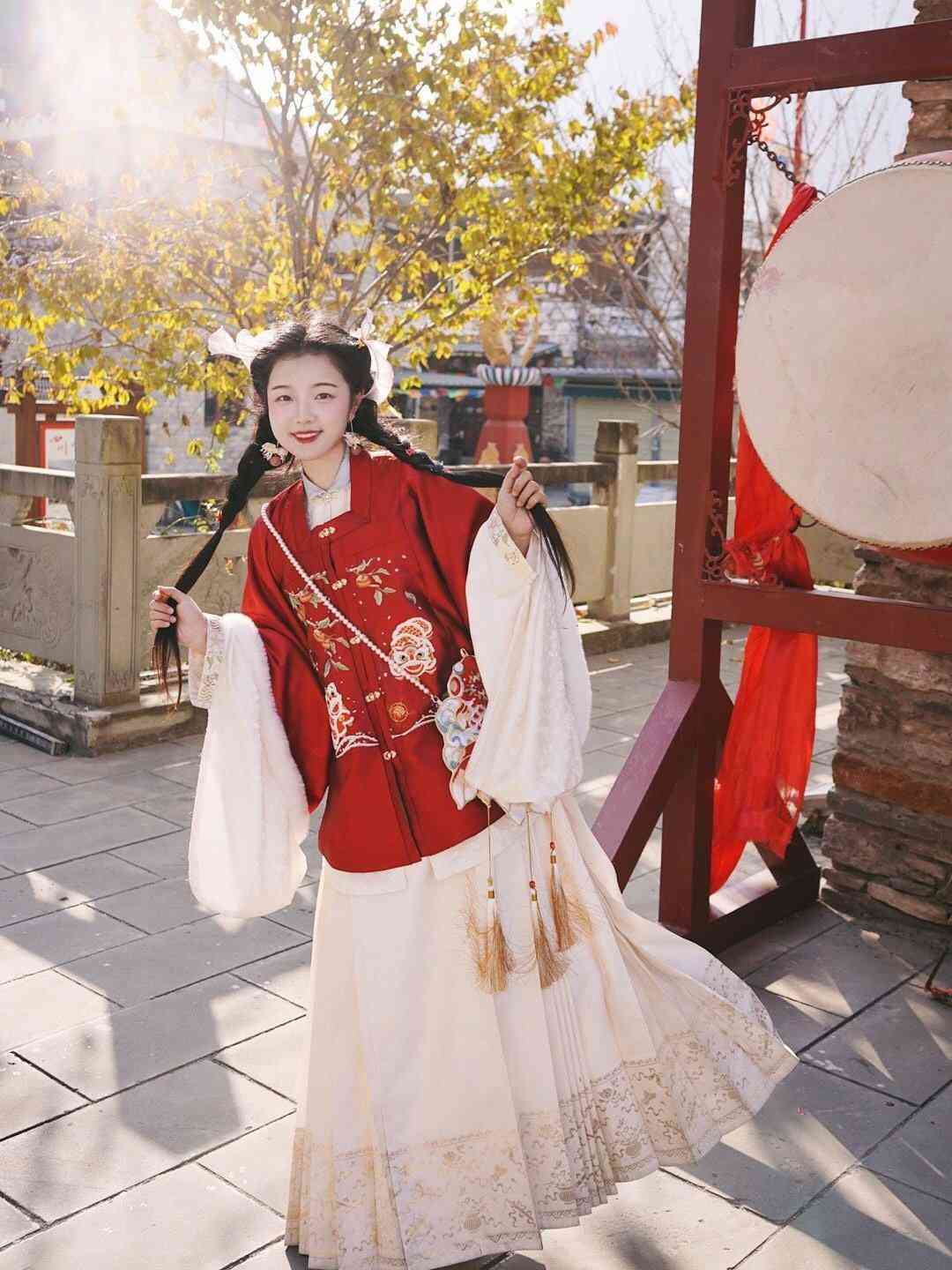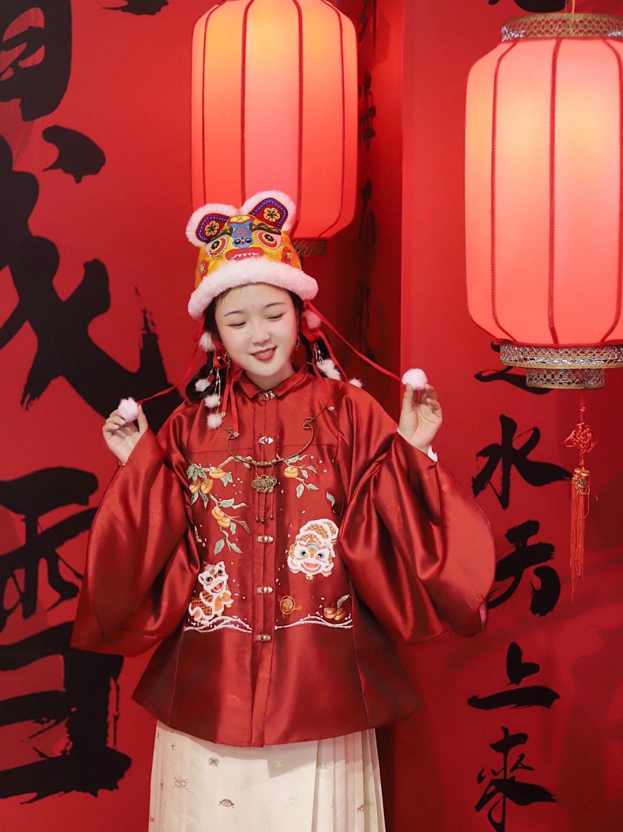 組圖里的小姐姐選擇的是一套大紅色調(diào)的漢服,上衣整體都是很亮眼的紅色,紅色的特點就是熱情似火,還帶有富貴吉祥的寓意,在衣服兩側(cè)還繡有活靈活現(xiàn)的小舞獅,非??蓯?。