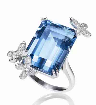 為什么我對這枚戒指印象這么深呢?它早在2011年韓雪出席某珠寶晚宴的時候就被曝光過,海藍(lán)寶石重達(dá)19.7克拉,周圍還設(shè)計有12顆白鉆鑲嵌而成的三只蝴蝶。據(jù)說估價6000萬!6000萬的海藍(lán)寶石我還真是次見…