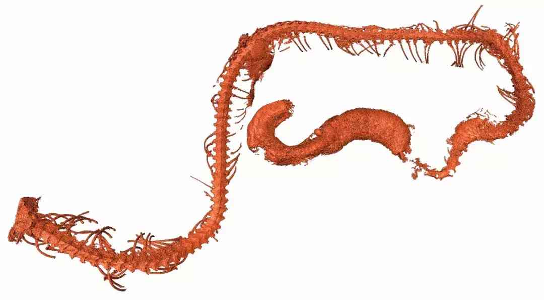 那這條蛇有多原始呢?研究團隊不僅對琥珀進行了顯微攝影,還利用顯微CT技術(shù)對標(biāo)本——一種能夠?qū)ξ⑿颖具M行內(nèi)部掃描的技術(shù),對它進行了掃描,然后再通過數(shù)據(jù)重建獲得樣品的三維模型。這樣一來就不用敲碎琥珀去研究里面的樣本……通過三維重建,最終,我們看到了這樣的結(jié)構(gòu):