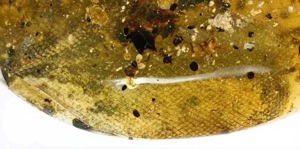 此外,琥珀還能為我們提供當(dāng)時的古環(huán)境信息。與這次琥珀曉蛇一同發(fā)現(xiàn)的,還有一塊帶有蛇皮的琥珀,后者應(yīng)該是較大型蛇類所蛻下的一小塊皮。