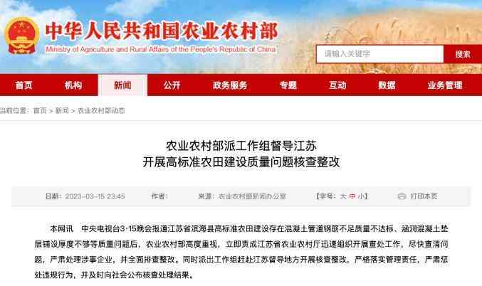 “3·15”晚會(huì)報(bào)道江蘇省濱海縣高標(biāo)準(zhǔn)農(nóng)田建設(shè)存在混凝土管道鋼筋不足質(zhì)量不達(dá)標(biāo)、涵洞混凝土墊層鋪設(shè)厚度不夠等質(zhì)量問題。