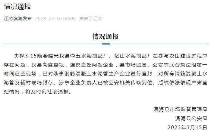 3月16日,“江蘇濱海發(fā)布”發(fā)布情況通報(bào)顯示,江蘇省鹽城市濱海縣李五水泥制品廠、億山水泥制品廠在參與農(nóng)田建設(shè)過程中存在問題,濱??h高度重視,連夜查處問題企業(yè),縣市場(chǎng)監(jiān)管、公安等聯(lián)合執(zhí)法組時(shí)間趕至現(xiàn)場(chǎng),已對(duì)涉事鋼筋混凝土水泥管生產(chǎn)企業(yè)進(jìn)行查封,對(duì)所有鋼筋混凝土水泥管及輔材現(xiàn)場(chǎng)封存。涉事企業(yè)負(fù)責(zé)人已被公安機(jī)關(guān)傳喚到位。后續(xù)依法依規(guī)嚴(yán)肅查處情況,將及時(shí)向社會(huì)通報(bào)。