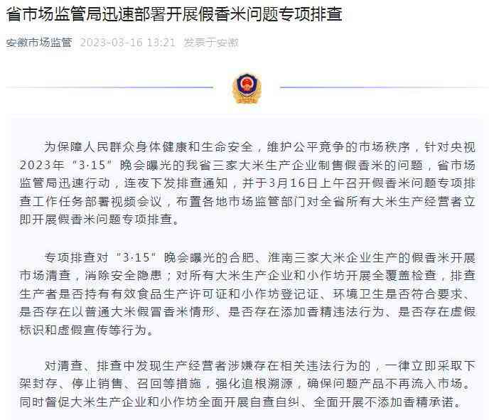 晚會(huì)曝光的合肥、淮南三家大米企業(yè)生產(chǎn)的假香米開展市場(chǎng)清查,消除安全隱患;對(duì)所有大米生產(chǎn)企業(yè)和小作坊開展全覆蓋檢查,排查生產(chǎn)者是否持有有效食品生產(chǎn)許可證和小作坊登記證、環(huán)境衛(wèi)生是否符合要求、是否存在以普通大米假冒香米情形、是否存在添加香精違法行為、是否存在虛假標(biāo)識(shí)和虛假宣傳等行為。