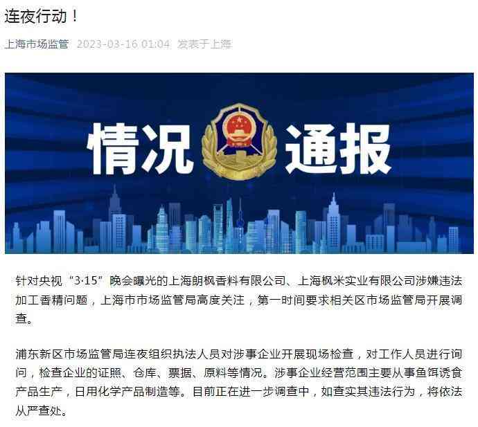 晚會(huì)曝光了上海朗楓香料有限公司、上海楓米實(shí)業(yè)有限公司涉嫌違法加工香精問題?!吧虾J袌?chǎng)監(jiān)管”16日通報(bào)顯示,上海市市場(chǎng)監(jiān)管局時(shí)間要求相關(guān)區(qū)市場(chǎng)監(jiān)管局開展調(diào)查。