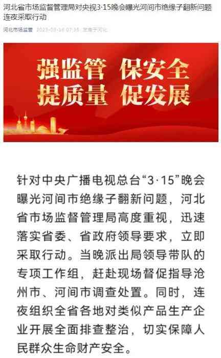 晚會(huì)曝光廢舊絕緣子刷刷即上市,大量翻新絕緣子流向多地電力工程。位于河北省滄州市河間市的滄州明發(fā)電力電器有限公司和河北慶榮電力器材有限公司被點(diǎn)名。“河北市場(chǎng)監(jiān)管”16日發(fā)布通報(bào)表示,河北省市場(chǎng)監(jiān)督管理局當(dāng)晚派出專項(xiàng)工作組,趕赴現(xiàn)場(chǎng)督促指導(dǎo)滄州市、河間市調(diào)查處置。同時(shí),連夜組織全省各地對(duì)類似產(chǎn)品生產(chǎn)企業(yè)開展全面排查整治,切實(shí)保障人民群眾生命財(cái)產(chǎn)安全。