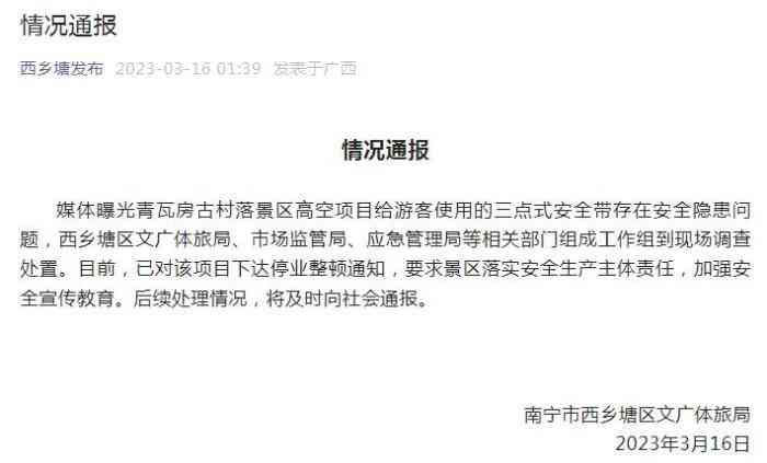 針對(duì)“3·15”晚會(huì)曝光青瓦房古村落景區(qū)高空項(xiàng)目給游客使用的三點(diǎn)式安全帶存在安全隱患問題,“西鄉(xiāng)塘發(fā)布”16通報(bào)稱,西鄉(xiāng)塘區(qū)文廣體旅局、市場(chǎng)監(jiān)管局、應(yīng)急管理局等相關(guān)部門組成工作組到現(xiàn)場(chǎng)調(diào)查處置。目前,已對(duì)該項(xiàng)目下達(dá)停業(yè)整頓通知,要求景區(qū)落實(shí)安全生產(chǎn)主體責(zé)任,加強(qiáng)安全宣傳教育。后續(xù)處理情況,將及時(shí)向社會(huì)通報(bào)。