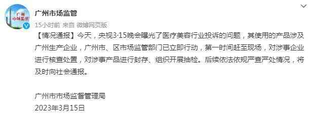 對(duì)此,廣州市市場(chǎng)監(jiān)督管理局3月15日晚發(fā)布通報(bào)稱,廣州市、區(qū)市場(chǎng)監(jiān)管部門已立即行動(dòng),時(shí)間趕至現(xiàn)場(chǎng),對(duì)涉事企業(yè)進(jìn)行核查處置,對(duì)涉事產(chǎn)品進(jìn)行封存、組織開展抽檢。