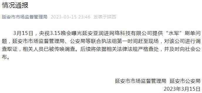 晚會(huì)曝光了一些平臺(tái)售賣直播水軍等行為。陜西亞潤(rùn)進(jìn)網(wǎng)絡(luò)科技有限公司是被曝光的公司之一。3月15日晚,陜西延安市場(chǎng)監(jiān)督管理局發(fā)布情況通報(bào),市監(jiān)局工作人員已經(jīng)前往亞潤(rùn)進(jìn)網(wǎng)絡(luò)科技有限公司地址處進(jìn)行調(diào)查取證,相關(guān)人員已被傳喚調(diào)查。后續(xù)將依據(jù)相關(guān)法律法規(guī)嚴(yán)格查處,并及時(shí)向社會(huì)公布。