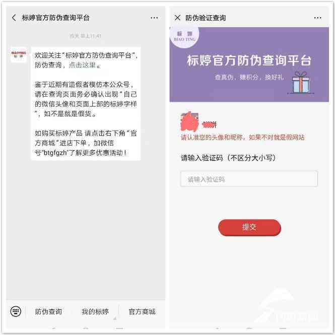 記者關(guān)注公眾號(hào)后出現(xiàn)了一段文字提示,“鑒于近期有造假者模仿本公眾號(hào),請(qǐng)務(wù)必確認(rèn)出現(xiàn)自己的微信頭像和頁(yè)面上部的標(biāo)婷字樣,如不是就是假貨”。點(diǎn)擊查詢,果然出現(xiàn)了自己的微信頭像和標(biāo)婷字樣。