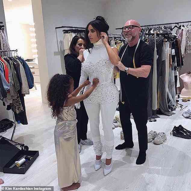 當(dāng)天試衣服的照片里,有一個(gè)小助手亮了,小助手穿著一件銀色的長(zhǎng)裙,在幫卡戴珊整理衣服,看起來很認(rèn)真的樣子。這個(gè)小姑娘正是卡戴珊的女兒西北。