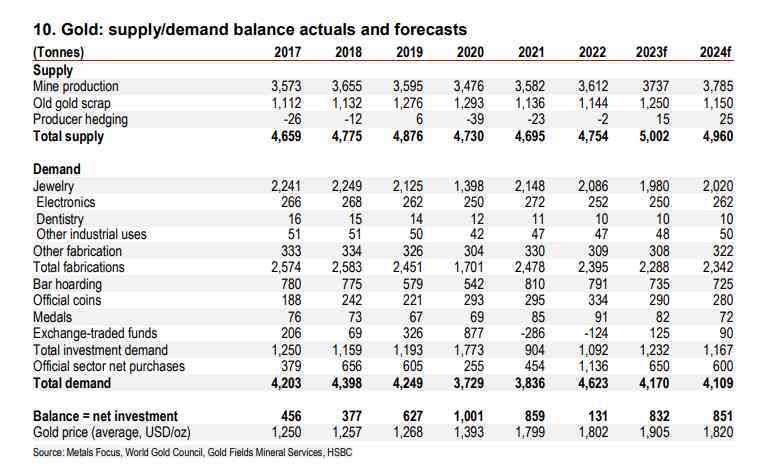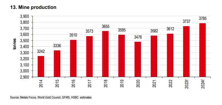 金礦開采面臨的真正挑戰(zhàn)可能在2025年之后,隨著新項目數(shù)量下降,新生產(chǎn)將越來越不足以抵消礦石品位下降和儲量枯竭,匯豐將2023年的預測從3757噸削減至3737噸,并將2024年的產(chǎn)量預測從3800噸下調(diào)至3785噸。
