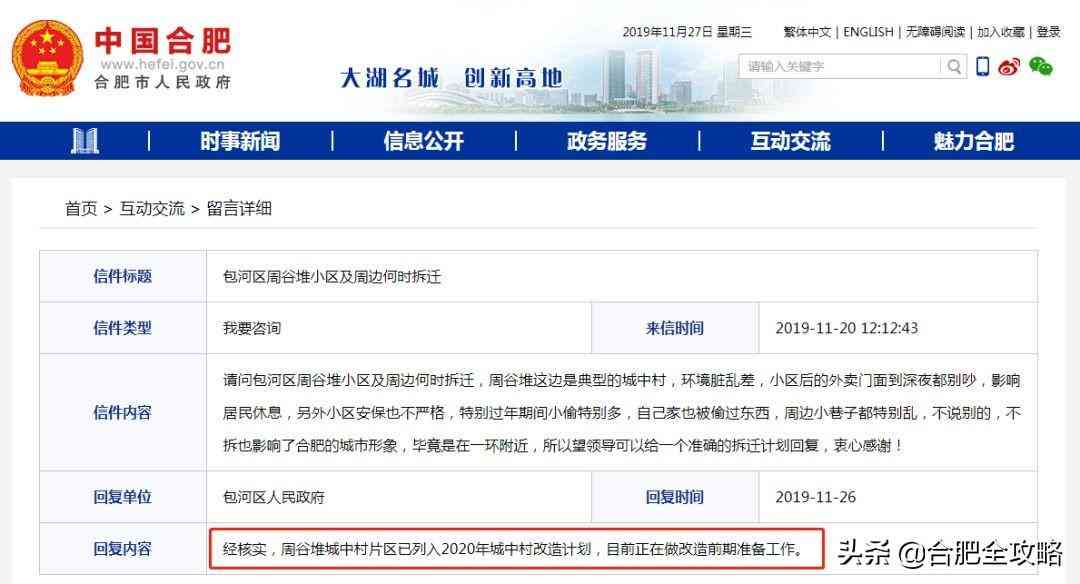包河區(qū)人民政府回復(fù) :經(jīng)核實(shí),周谷堆城中村片區(qū)已列入2020年城中村改造計(jì)劃,目前正在做改造前期準(zhǔn)備工作。