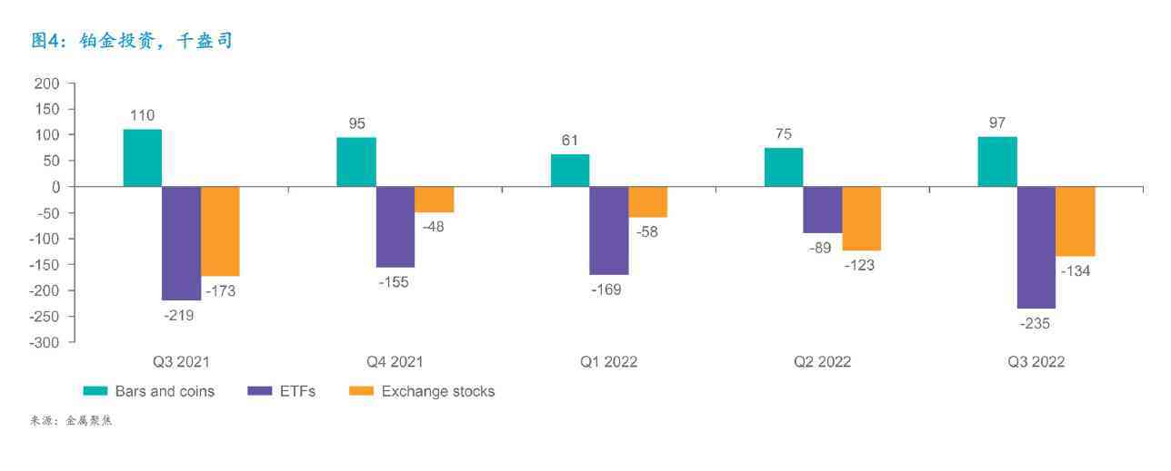 上述WPIC報告統(tǒng)計顯示,2022年第三季度鉑金投資領(lǐng)域的凈拋售額為27.2萬盎司。其中鉑金ETF拋售23.5萬盎司;交易所鉑金交割庫存減少13.4萬盎司;唯有鉑金條幣投資需求錄得增長,為9.7萬盎司,較第二季度環(huán)比增長29%,但同比下降了12%。由此預(yù)計2022全年鉑金投資市場的凈拋售額為52.5噸。