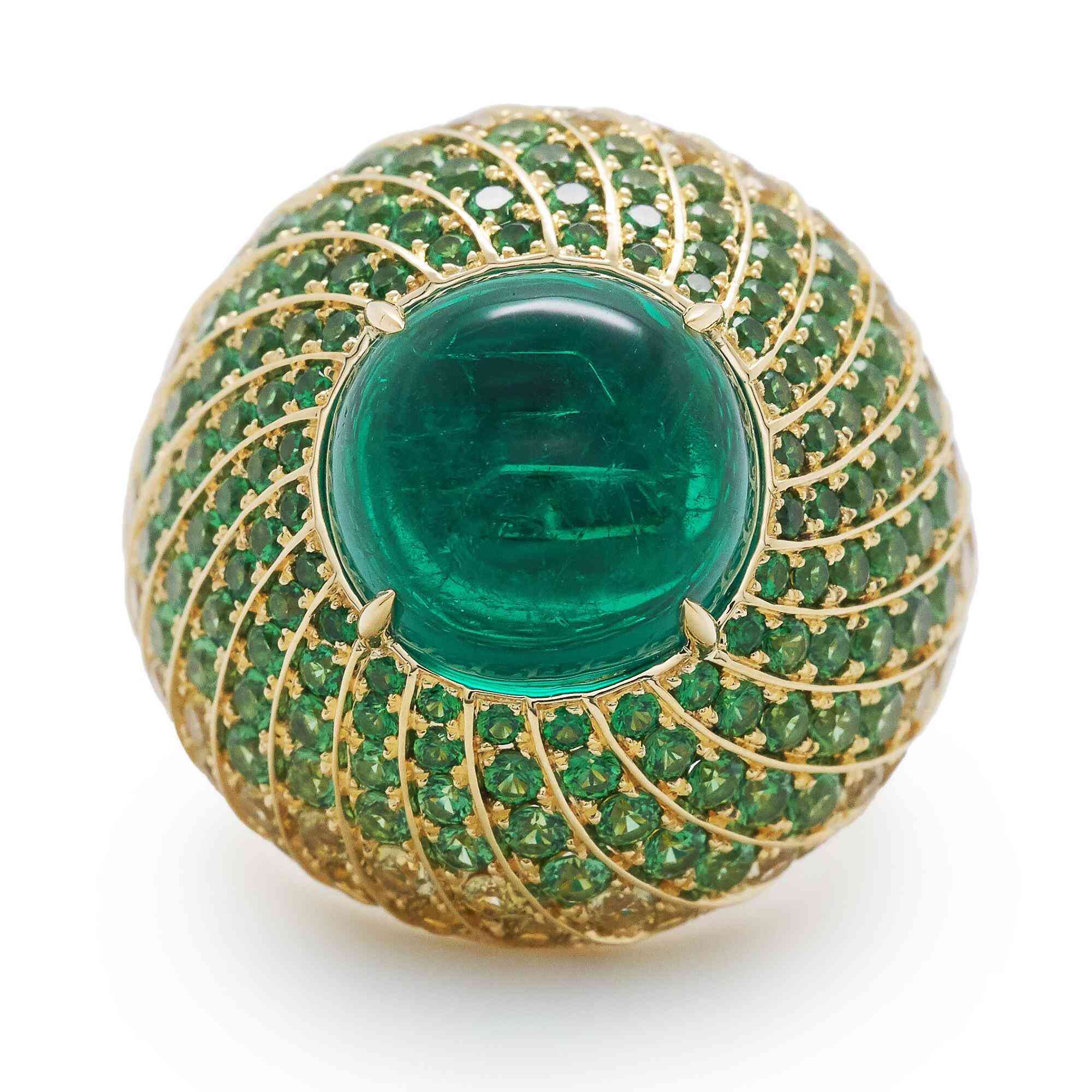 導(dǎo)讀: 主石為一顆7.65克拉哥倫比亞祖母綠寶石,黃金戒托,鑲嵌小顆祖母綠寶石及黃鉆。這枚「Leaves of the Sun」...