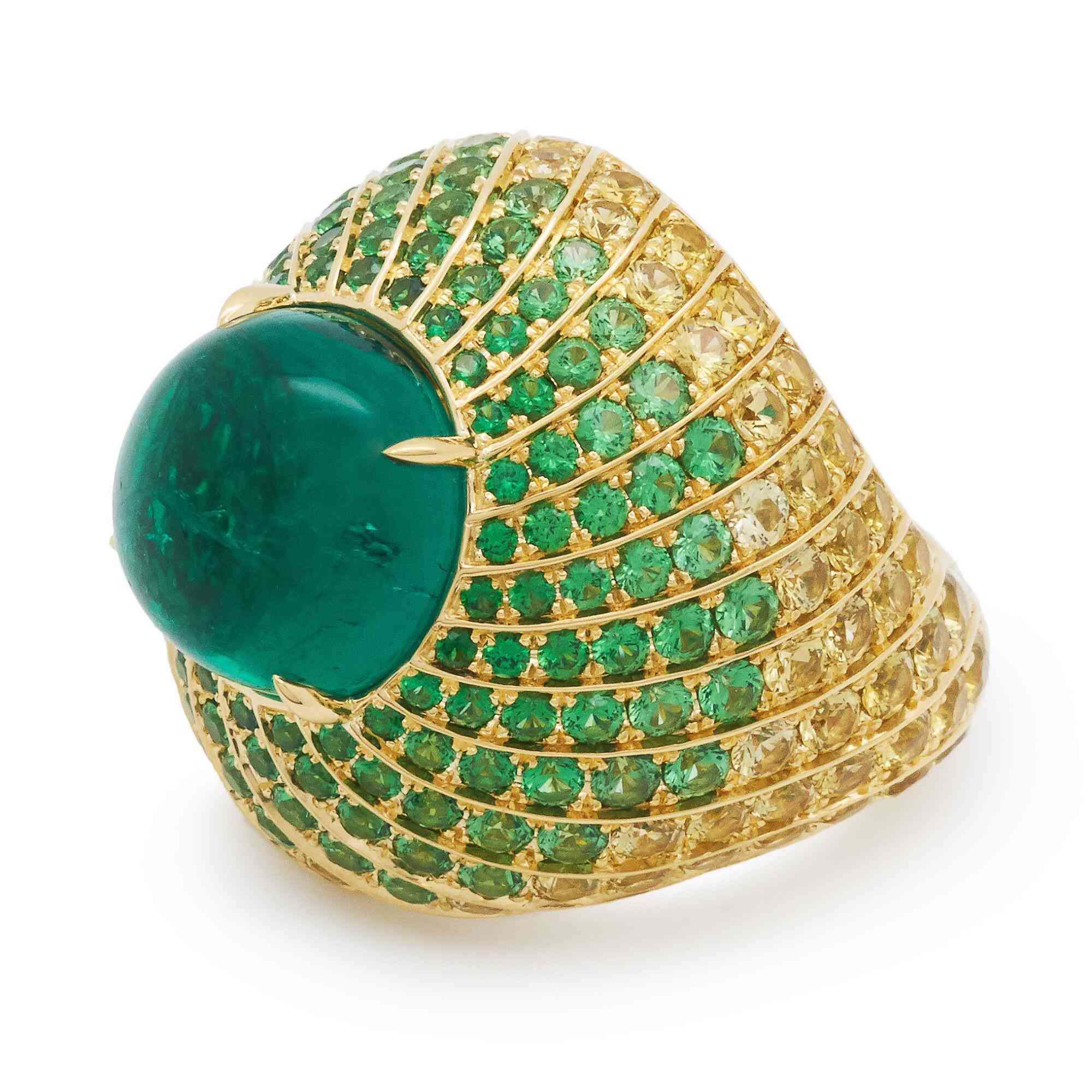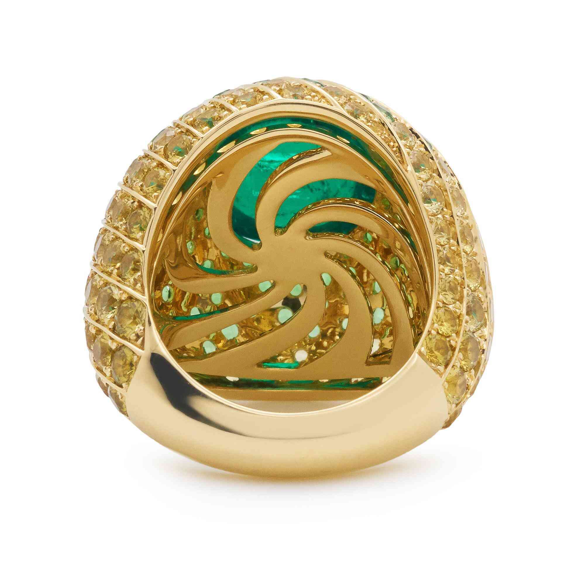 戒面圓潤(rùn)的弧形造型由超過(guò)20枚纖細(xì)的棕櫚葉簇?fù)順?gòu)成,每一片葉子都設(shè)計(jì)為流線型,由戒面自然延伸至戒壁,從戒指頂部欣賞如同漩渦圖案一般。葉片軌道中依次鑲嵌圓形切割祖母綠和黃色藍(lán)寶石,模仿了棕櫚葉色調(diào)的自然過(guò)渡。