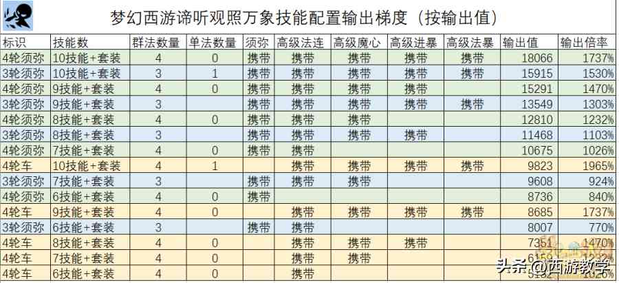 這是最近大神做的帶著觀照萬(wàn)象的諦聽(tīng)的各種技能的輸出梯度,這個(gè)就可以供大家在選擇諦聽(tīng)的時(shí)候該如何選擇攜帶的技能,分為群法數(shù)量、須彌、四本法術(shù)書(shū)的攜帶情況,大家可以僅供參考,希望對(duì)大家有所幫助!