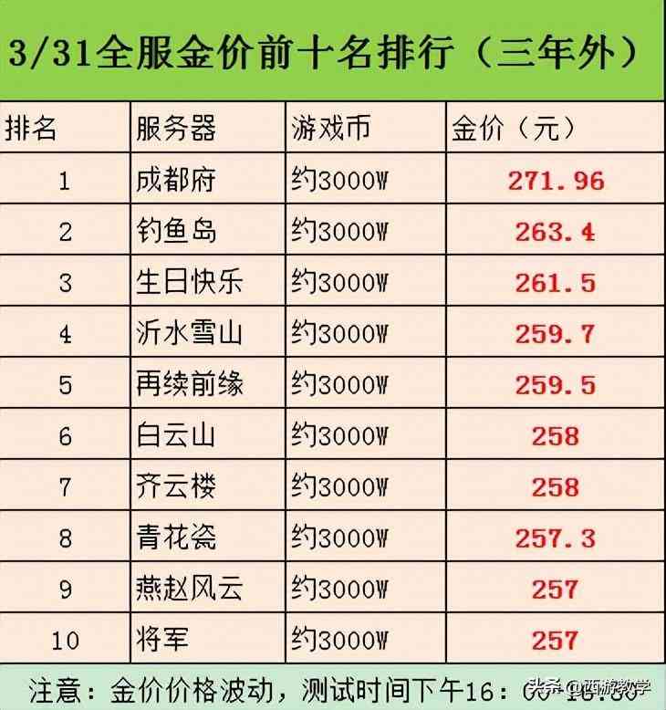 今天是四月份的天,然后昨天就統(tǒng)計(jì)好了全服金價(jià)排名前十名的服務(wù)器,希望對(duì)于大家有所幫助,排名名的服務(wù)器是成都府,比例是271.96,還是比較高的,下面的分別是釣魚(yú)島、生日快樂(lè)、沂水雪山、再續(xù)前緣、白云山、齊云樓、青花瓷、燕趙風(fēng)云、將軍,不知道你們的服務(wù)器有沒(méi)有出現(xiàn)在里面呢?