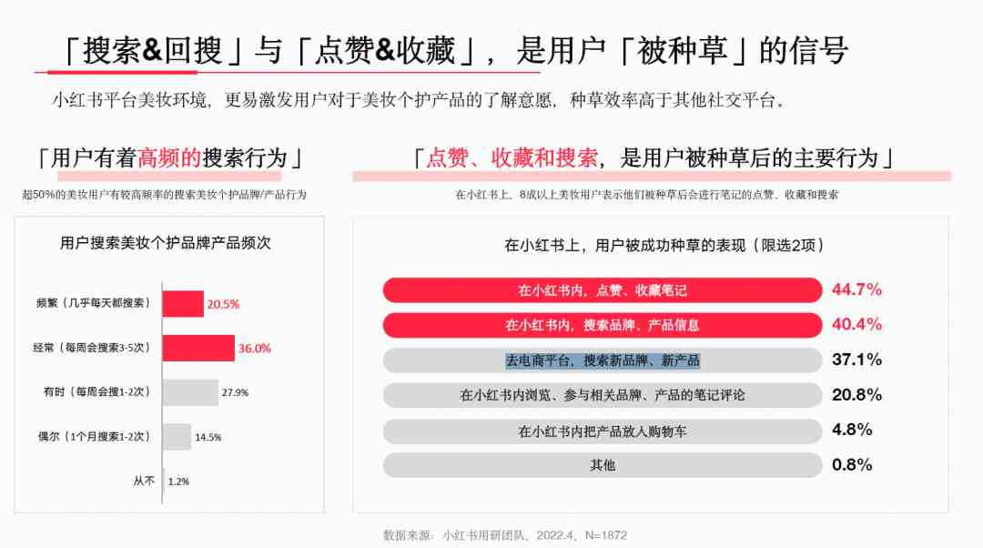 從美妝品類的種草轉(zhuǎn)化角度來看,其中接近9成的小紅書美妝用戶群體均表示購買了被種草過的品牌產(chǎn)品,期間里她們也會通過對筆記的點贊、收藏以及具有高頻率特性的主動搜索相關(guān)品牌產(chǎn)品信息這3個行為軌跡作為對眼前產(chǎn)品感興趣的信號。這也是品牌方在小紅書進行內(nèi)容營銷推廣的主要核心目的,即完成種草階段。