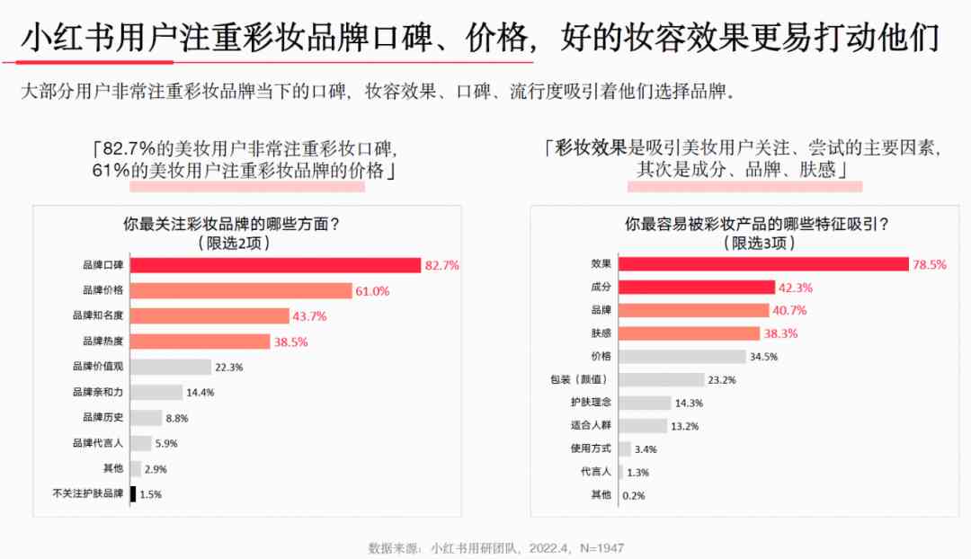 在護膚品牌的選擇決策上,因用戶美妝知識不斷積累,消費決策也趨于冷靜理性。所以她們會多維度考察品牌特征與產(chǎn)品優(yōu)勢。可以發(fā)現(xiàn)其中品牌口碑是關(guān)注核心,可直接影響種草與用戶購買行為。