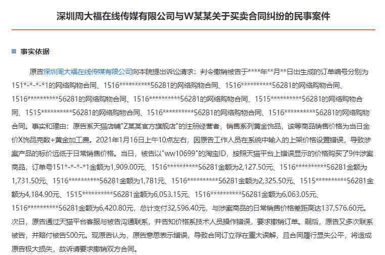 文書顯示,2021年1月16日,深圳周大福公司系統(tǒng)技術(shù)人員操作錯(cuò)誤,將網(wǎng)店系列黃金飾品的標(biāo)價(jià)設(shè)置為遠(yuǎn)低于日常售價(jià)。
