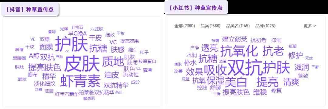 根據(jù)飛瓜美妝數(shù)據(jù),雙抗精華在抖音種草關(guān)鍵詞以成分為主。根據(jù)播主口播關(guān)鍵字提取與視頻花子內(nèi)容AI分析,“蝦青素”成分最常出現(xiàn)在關(guān)鍵點(diǎn)中且互動(dòng)反饋較好。而在小紅書(shū)種草宣傳點(diǎn)分析中可以看到,主打抗氧化、提亮等功效類宣傳詞更受關(guān)注。