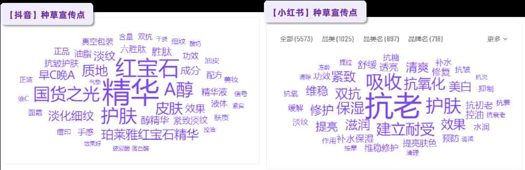 根據(jù)飛瓜美妝數(shù)據(jù),紅寶石精華在抖音種草關(guān)鍵詞突出了A醇成分。小紅書(shū)宣傳點(diǎn)則重點(diǎn)發(fā)力在抗老功效。