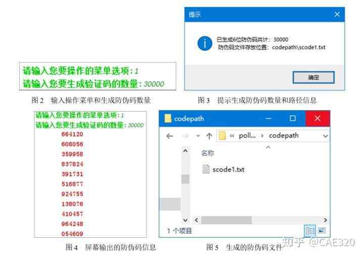 (1)生成6位數(shù)字防偽編碼。當(dāng)用戶在主程序界面中輸入數(shù)字“1”菜單項時,將進(jìn)入“生成6位數(shù)字防偽編碼 (213563型)”的功能執(zhí)行任務(wù)。此時要求輸入生成防偽碼的數(shù)量,可以根據(jù)需要輸入生成防偽碼的數(shù)量,如圖2所示。按下鍵,開始批量生成防偽碼,生成后系統(tǒng)將提示用戶生成了多少個注冊碼和生成文件的位置信息等,如圖3所示。單擊“確定”按鈕,關(guān)閉提示信息。在屏幕上可以看到生成的防偽碼信息,如圖4所示。生成的文件在程序所在目錄下的“codepath”文件夾下,名稱為“scode1.txt”,如圖5所示。