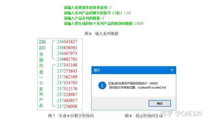(2)生成9位系列產(chǎn)品數(shù)字防偽編碼。在主程序界面中輸入數(shù)字“2”菜單項時,將進(jìn)入“生成9位系列產(chǎn)品數(shù)字防偽編碼”的功能執(zhí)行。在產(chǎn)品系列其實編碼輸入中輸入235,在系列產(chǎn)品數(shù)量中輸入5,在每個系列生成數(shù)量中輸入10000,如圖6所示,按下鍵,開始生成防偽碼。生成后系統(tǒng)將提示用戶生成防偽碼信息,如圖7所示。同時彈出如圖8所示的提示對話框,單擊“確定”按鈕,關(guān)閉提示對話框.