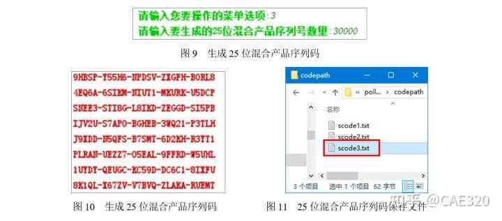 (3)生成25位混合產(chǎn)品序列號。在主程序界面中輸入數(shù)字“3”菜單項時,將進(jìn)入“生成25位混合產(chǎn)品序列碼”的功能執(zhí)行。在輸入要生成的數(shù)量中輸入30000,如圖9所示,并且按下鍵,將生成30000個如圖10所示的25位防偽碼。生成的文件名稱如圖11所示。