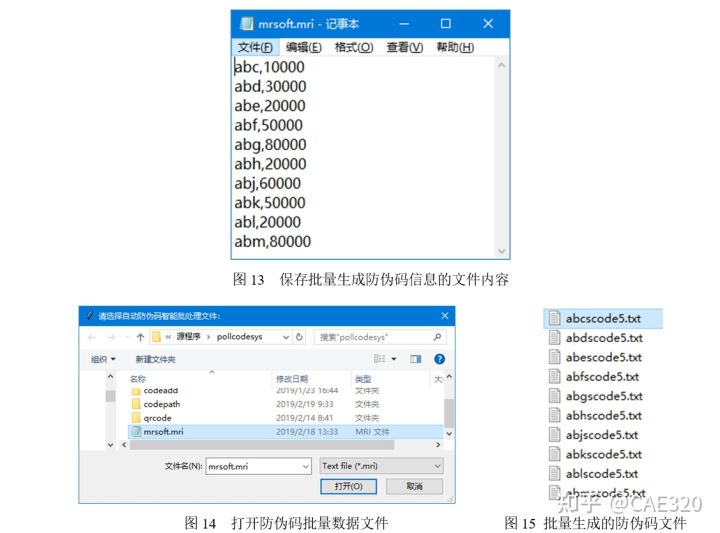 (5)智能批量生成帶數(shù)據(jù)分析功能的防偽碼。當(dāng)用戶在功能選擇界面中輸入數(shù)字“5”時,進(jìn)入智能批量生成帶數(shù)據(jù)分析功能的防偽碼功能選項,在彈出的對話框中,選擇保存批量生成防偽碼信息的文件(擴展名為.mri的文件,文件內(nèi)容如圖13所示,其中前面的3位字母是數(shù)據(jù)分析碼,后面的數(shù)值是防偽碼的個數(shù)),如圖14所示,單擊“打開”按鈕,將批量生成防偽碼信息,并把不同類別的防偽碼文件保存在不同的文件中,如圖15所示。