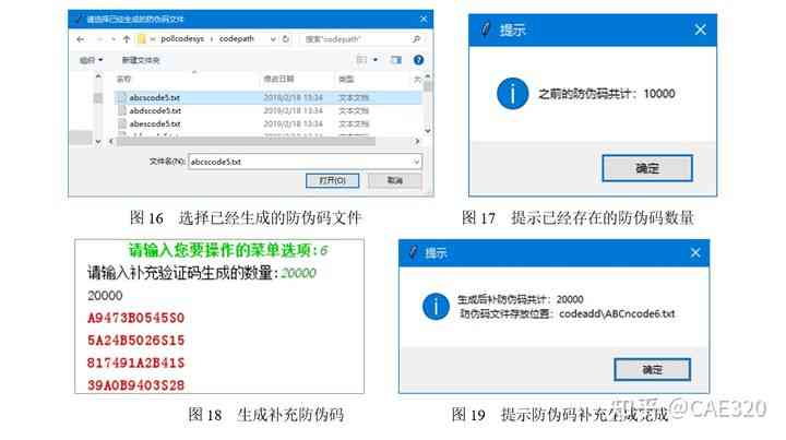 (6)后續(xù)補加生成防偽碼。在功能選擇界面中輸入數(shù)字“6”時,將進(jìn)入補充防偽碼生成功能選項。首先在打開的對話框中選擇已經(jīng)生成的防偽碼的文件(需要使用前4步中生成的防偽碼文件),如圖16所示。系統(tǒng)將自動分析已經(jīng)生成的防偽碼數(shù)量,并給出提示對話框,如圖17所示。接下來要求用戶輸入補充防偽碼的數(shù)量,根據(jù)要求的防偽碼數(shù)量循環(huán)生成新防偽碼,如圖18所示。完成后將提醒防偽碼已經(jīng)完成,并提示新生成的防偽碼文件的保存位置,如圖19所示。