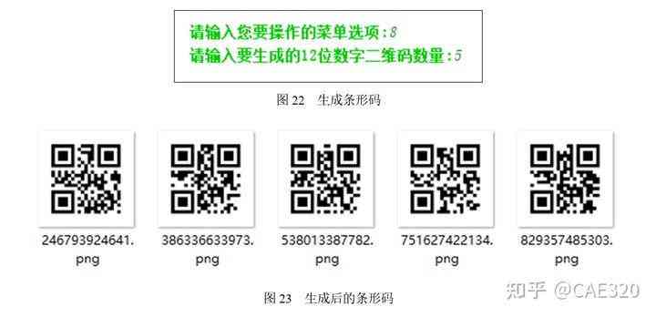 (8)二維碼批量輸出。在功能選擇界面中輸入數(shù)字“8”時,將進(jìn)入二維碼批量輸出功能選項。在請輸入要生成的12位數(shù)字二維碼數(shù)量中輸入二維碼的數(shù)量,這里輸入5,并按下鍵,將自動生成二維碼,如圖22所示。生成后的文件保存在項目根目錄下的barcode目錄中,效果如圖23所示。