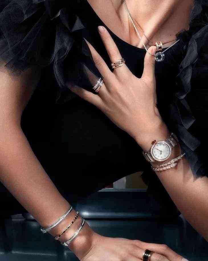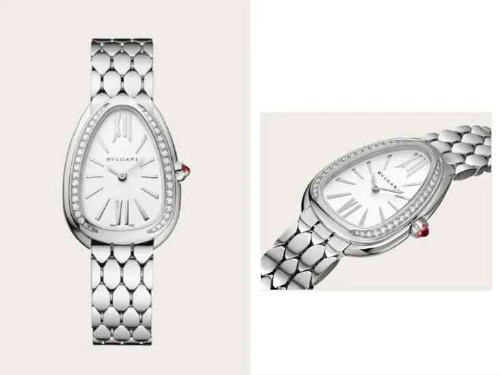 蛇形一直是寶格麗經典的品牌象征,Serpenti Seduttori系列表盤是水滴形蛇頭,表盤薄,凸形蛋面切割寶石裝飾,表帶是借鑒Serpenti系列的蛇鱗造型,六邊形鏈節(jié)。這些細節(jié)疊加在一起,整個表的造型仿佛是流動的,有種‘時光流動,我一直美好’的氣質在里面。