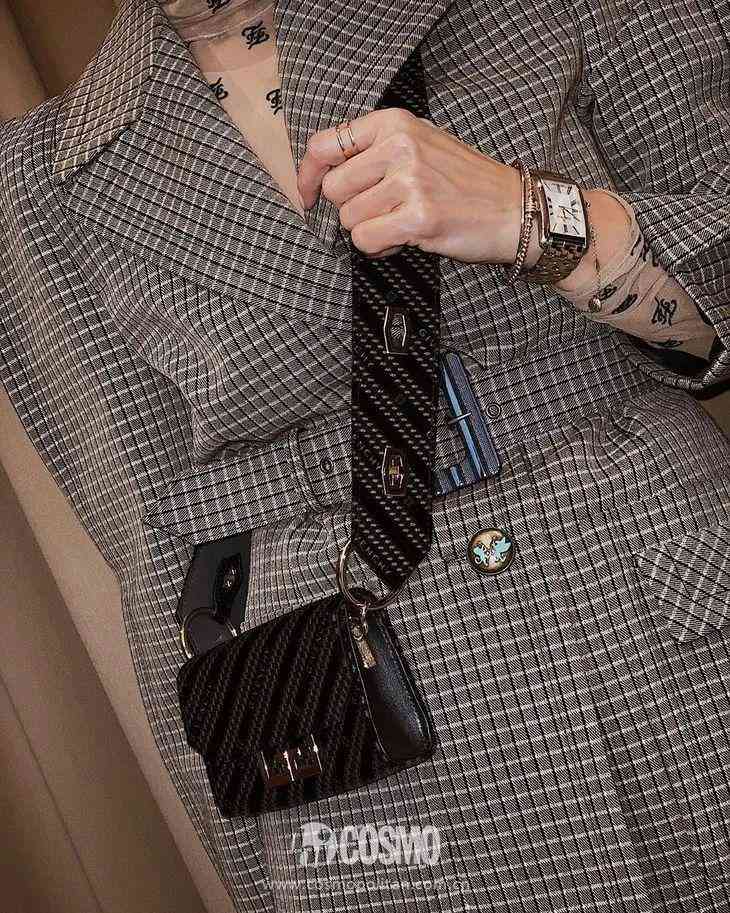 皮帶腕表疊搭金屬飾品乍看突兀,但其實細節(jié)結合得很巧妙,皮質既能豐富層次感還能減少全金屬的夸張感。