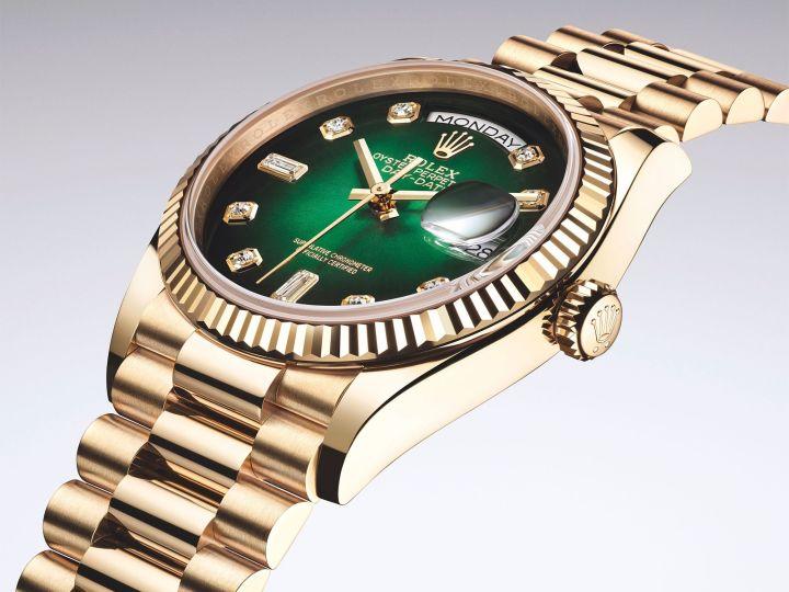 勞力士 Day-Date 綽號為“總統(tǒng)”,因為它曾戴在許多首席執(zhí)行官的手腕上,有多種尺寸和顏色可供選擇;最低調(diào)的是 36 毫米表款,所有表殼均由實心金塊銑削而成,底蓋采用勞力士制表師專用的特殊工具密封擰緊。旋入式表冠采用勞力士的Twinlock雙重防水系統(tǒng)。表圈鑲嵌著防刮藍寶石水晶玻璃和專利的凸鏡——勞力士星期日歷型的標(biāo)志——在 3 點鐘位置的窗口中放大日期。