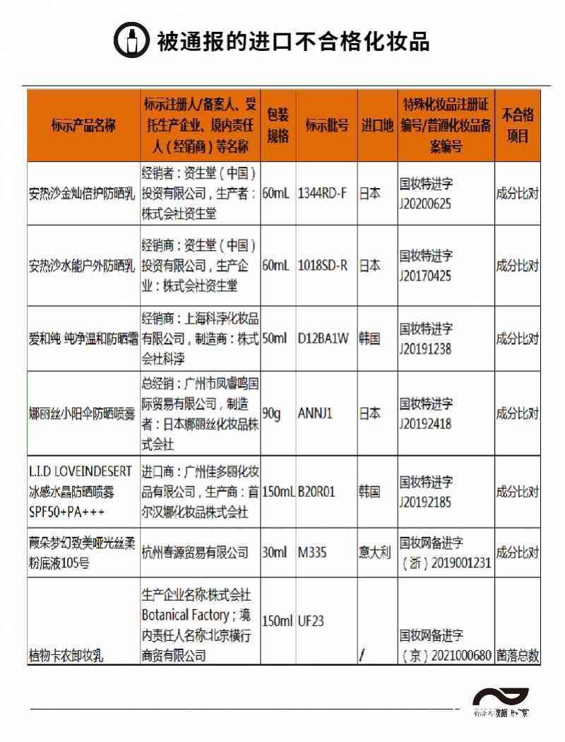 在近期官方的不合格化妝品通報中,還出現(xiàn)了多批次進(jìn)口品牌的身影。如2022年的12月22日《國家藥監(jiān)局關(guān)于53批次不符合規(guī)定化妝品的通告》就通報了安熱沙、愛和純、娜麗絲等6批次進(jìn)口化妝品。