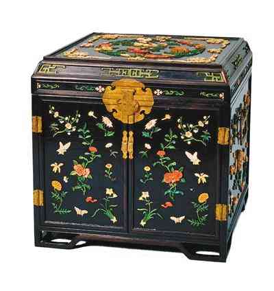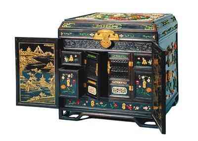 區(qū)別在于整體裝飾方法。首先,除了門外,大多數(shù)盒子都不是雕刻或涂漆的,而是用不同大小和形狀的銅皮裝飾。化妝盒上的一些化妝品幾乎被液體覆蓋。每塊銅皮上都刻有鑿線,內(nèi)容主要是花朵,文字,如意,人物等。切口處襯有彩色絲織物。其次,除了梳妝盒門上的浮雕裝飾外,浮雕上還將浮雕大面積的金,沙,蝸牛,膠玻璃等裝飾。在居住的地區(qū),例如文成縣,蒼南縣和泰順縣,在浮雕的底部還將用中國紅,淡綠色和藍(lán)色裝飾。另外,在溫州古代的梳妝盒中,存在著一種殘存較少,更具地方特色的類型,即什錦梳妝盒。所謂"什錦"是指盒子的內(nèi)部有十多個(gè)小塊,每個(gè)正方形都有一個(gè)蓋板,并且蓋板上的底色以浮雕的形式表現(xiàn)出來,而雕刻的裝飾品則是各種花朵,水果,硬幣,雜項(xiàng)寶物等。 "什錦"可能由此而來。