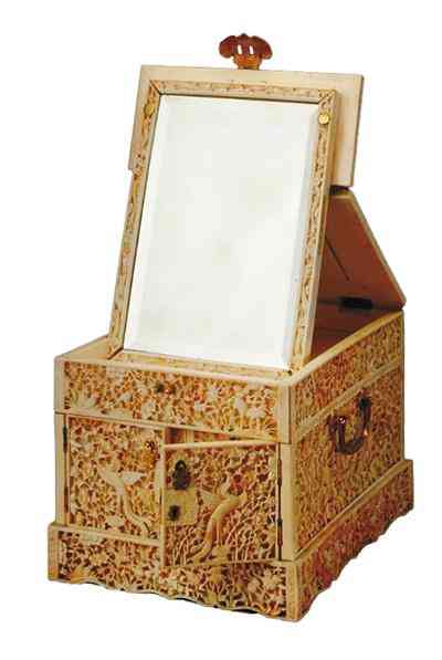 清代的梳妝盒子的風(fēng)格是一種方形結(jié)構(gòu)。蓋子可以翻轉(zhuǎn),并且鏡子在蓋子內(nèi)部折疊。箱體的前部沒有門或雙門。雙開門的大部分門上都刻有浮雕圖案,主體大多是吉祥圖案,例如百子,才華橫溢的女士和美麗的花朵以及鮮花。門上建有3個(gè)抽屜,通常在上下分布。盒子下面有一個(gè)方形的基座,該結(jié)構(gòu)類似于其他區(qū)域的化妝盒結(jié)構(gòu)。