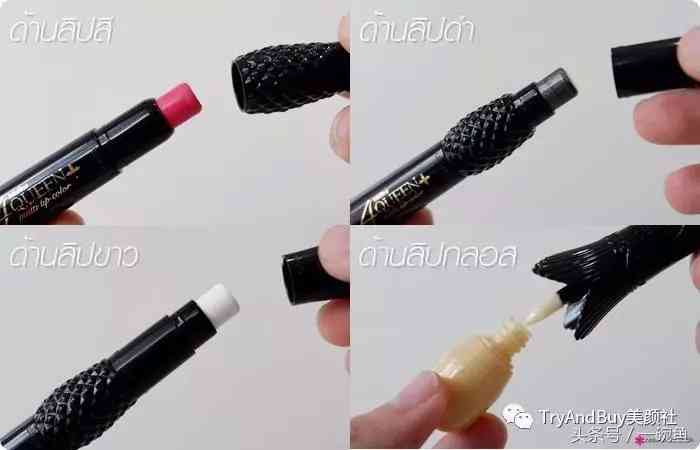 一支唇膏有四種用法,可以分段拆開,黑白色用來加深減淡唇色,頂部的唇蜜還能打造bling bling的妝效。