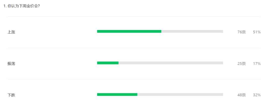 北京黃金經(jīng)濟發(fā)展研究中心調(diào)查顯示,市場人士認為本周金價振蕩可能性較大。投票顯示,本周有51%的讀者看漲本周金價、17%看振蕩、32%看空。