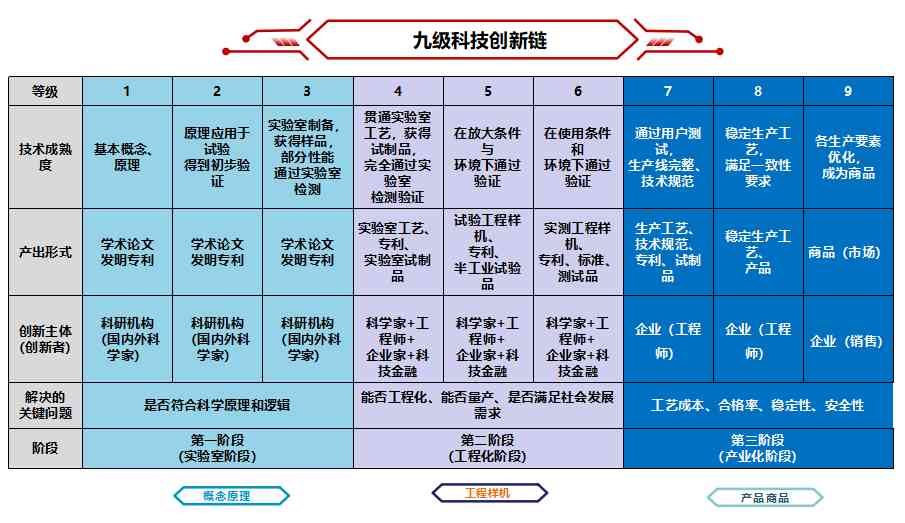目前,國家公認的產(chǎn)學研流程分為九級科技創(chuàng)新鏈,其中1-3級是基礎研究階段,主要在實驗室中,創(chuàng)新主體以科研人員為主;4-6級是工程化階段,探索是否有量產(chǎn)的可能,這時工程師、企業(yè)就加入進來了;而7-9級是產(chǎn)業(yè)化階段,主要由企業(yè)核算生產(chǎn)成本、建立技術規(guī)范、量產(chǎn)標準等。
