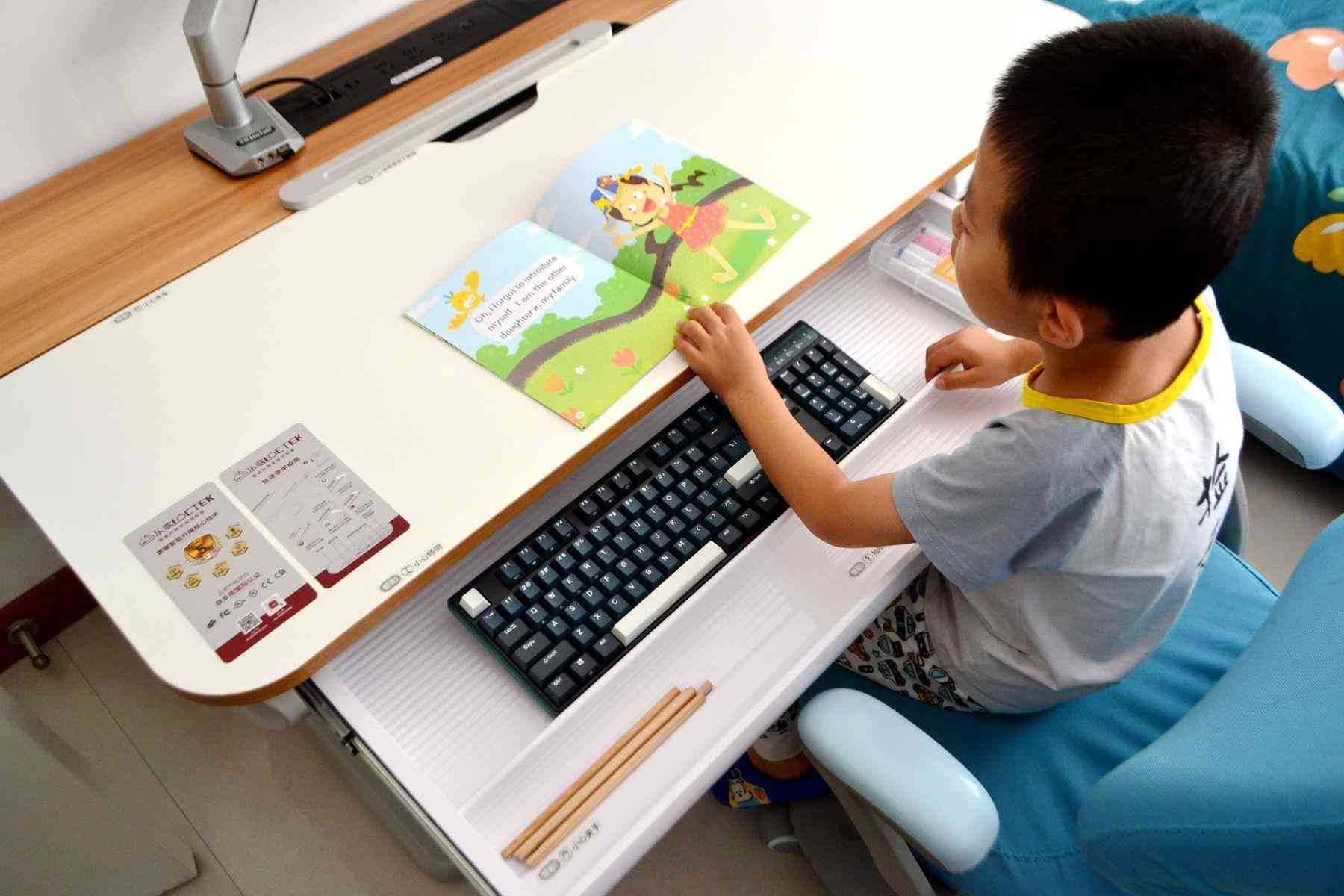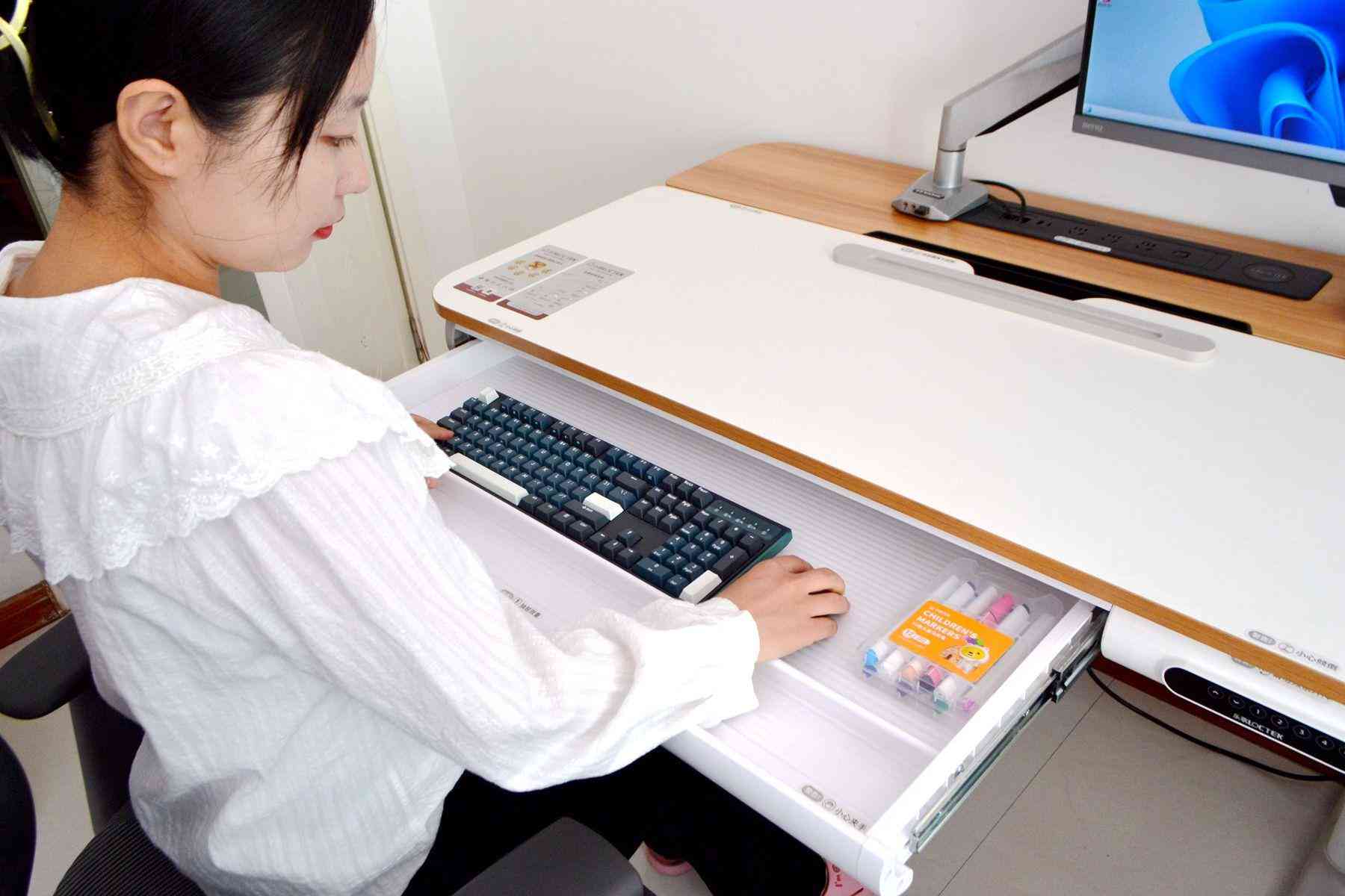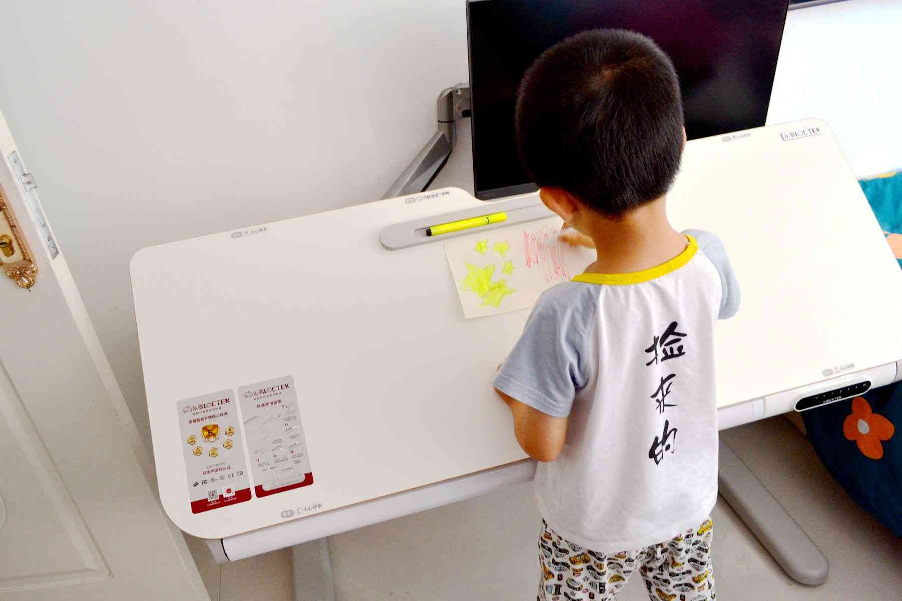 樂歌EC7這款智能升降書桌,作為書桌用,孩子可以站著,調(diào)節(jié)到舒服的高度,把桌板立起來,調(diào)節(jié)成45°角,再用樂歌的磁吸擋板固定好畫紙,這樣就可以非常舒服的站著畫畫寫生了。放學回家,坐在電腦桌前,調(diào)節(jié)好舒適的高度,寫作業(yè)。超大的桌面,完全可以給家長留下足夠的空間坐在旁邊指導孩子完成作業(yè)了。