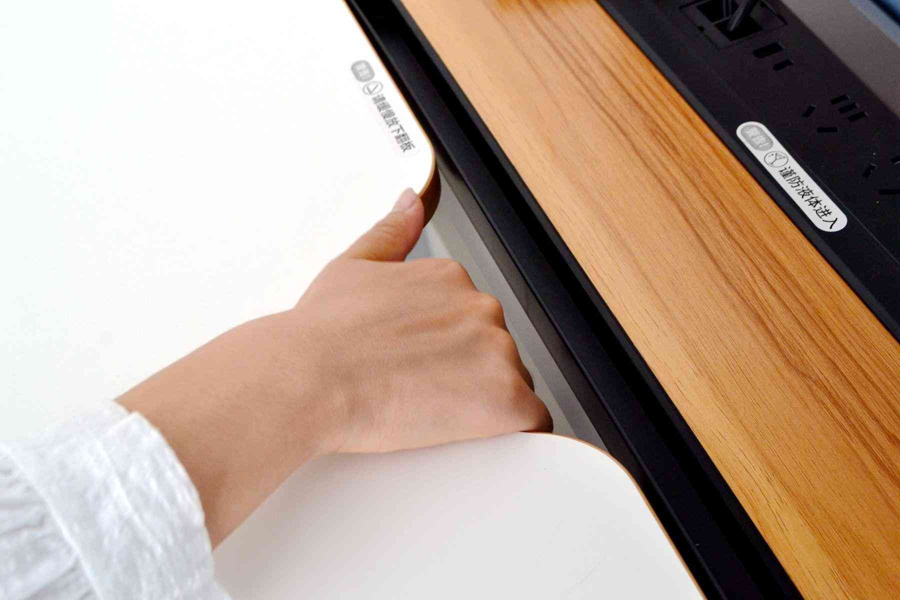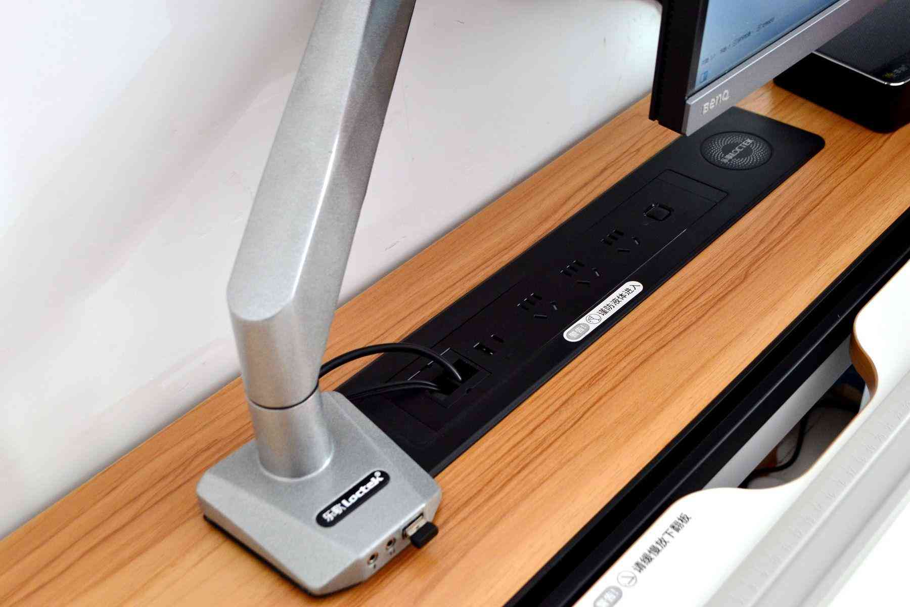 令人驚喜的是,在桌面的底部,還設有一個插線板,插線板上預留了三個國標插孔,三個國標插孔,完全可以把顯示器、電腦主機的電源插在下面了,這樣的話,桌面就真正意義上可以實現(xiàn)無線桌面了。