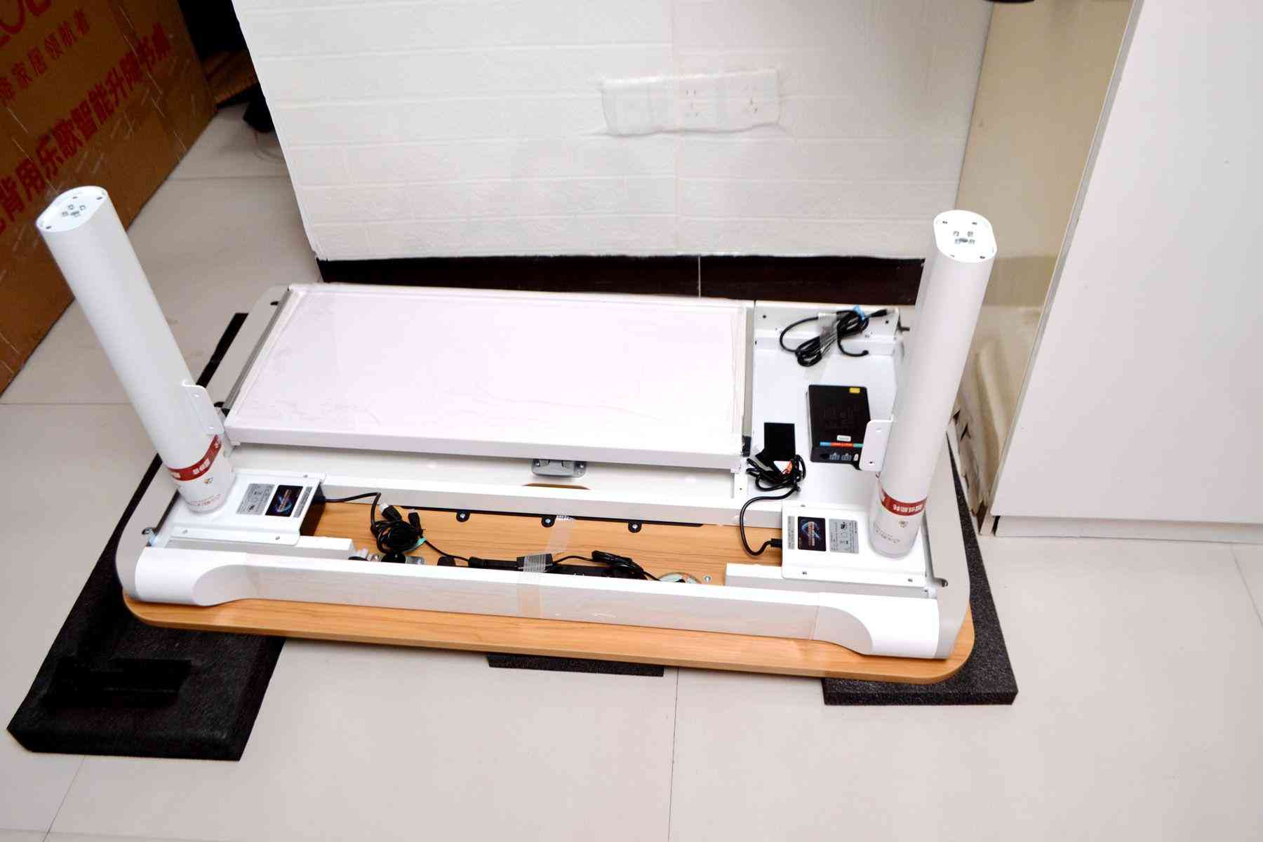 好了,廢話不多說,接下來,我們就一起來動手組裝我的無線桌面吧。樂歌是免費包安裝的,收到貨后,真的比我想象中要重很大,雖然當時買之前有看過參數(shù),但是,真沒想到,桌子會這么重,建議還是讓售后幫忙安裝吧,一個人確實不太好操作。其實安裝的話,倒是非常簡單,動手能力強的話,完全可以自己安裝,非常簡單,先把電腦桌底部的兩個升降桌腿和擋板和桌面對接安裝好,線纜樂歌都標記好了顏色,對準顏色插好就可以了,最后再把底部的支架裝好就可以了,安裝還是蠻簡單的,就是各個部件都很重,所以一個人不太好搞定。