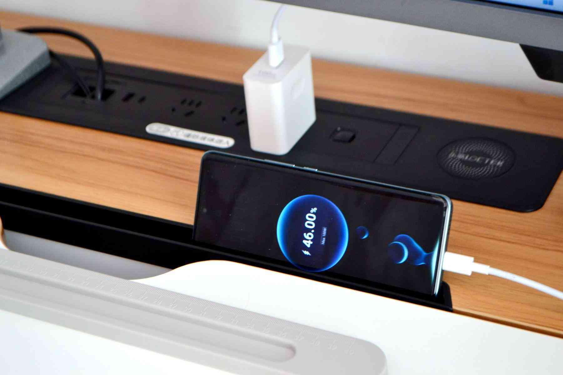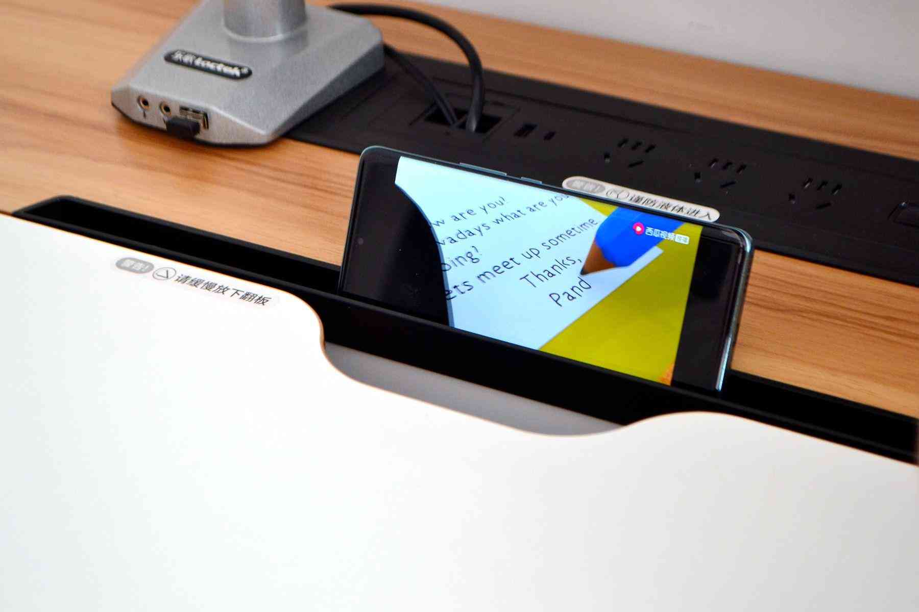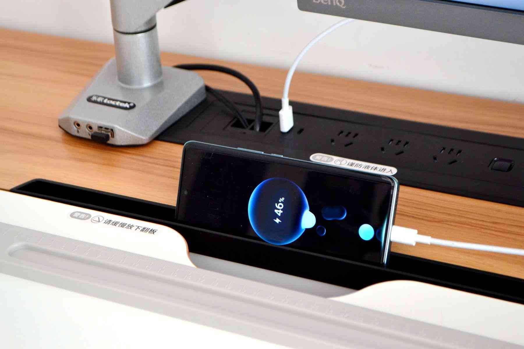 值得一提的是,在最右側(cè)還設有一個無線充電板,功率為10W,可以把支持無線充的手機隨手放桌面上,完成充電,非常方便。我的手機是iPhone11,實測是支持無線充。