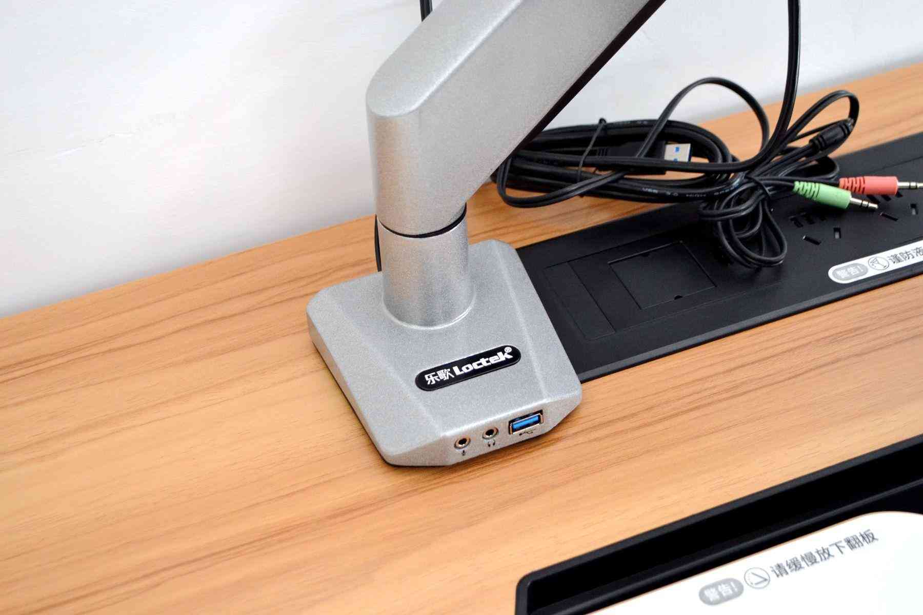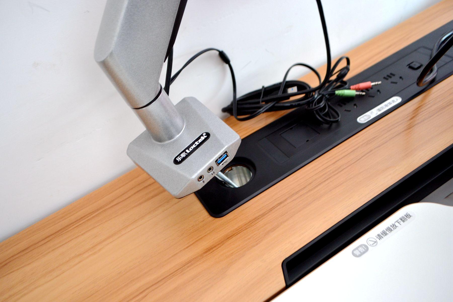 當然,為了更好地打造無線桌面,這次我還特意買了個樂歌的機械用來安裝顯示器。因為在桌子最左側(cè),樂歌EC7還預留了安裝機械臂的孔位,并在孔位右側(cè)配備了三個不同孔位的走線盒,可以把機械臂的線纜穿過走線盒,讓桌面不留任何多余的線纜。下圖就是我安裝好機械臂的效果了,理論上是樂歌EC7是支持所有品牌的機械臂的,我為了讓整體更美觀,選購的也是樂歌的機械臂,銀色的外觀和桌子整體看上去也很搭,非常好看。
