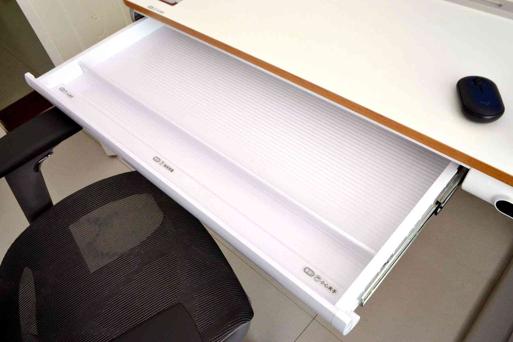 在桌面的底下還設有一個非常大容量的抽屜,平時可以放一些孩子用的學習用具,也可以放一些U盤、鍵盤等大小數(shù)碼物件,超大的抽屜可以更好的幫我們整理桌面,保持桌面的整潔。